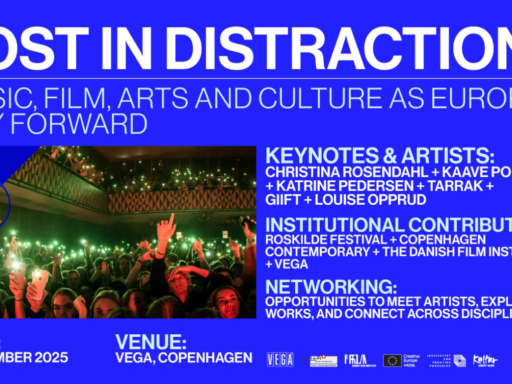 NYT FRA CREATIVE EUROPE Filminstituttets opslagstavle for branchen 17. sep 2025. VIDSTE DU at Filminstituttet har en online opslagstavle for branchen? Mød de skandinaviske MEDIA Deske på Nordisk Panorama 16. sep 2025. Den 36. udgave af kort- og dokumentarfestivalen Nordisk Panorama er netop startet. Under branchedelen Nordisk Panorama Forum har du mulighed for at møde de skandinaviske MEDIA Deske. Beta testing of the Carbon Calculator 05. sep 2025. Be Part of the Change: Join the Public Beta of the MEDIA Carbon Calculator! Testing of the tool is now available for professionals, without pre-registration. Deltag i kulturkonferencen Lost in Distraction? 03. sep 2025. KONFERENCE. Den 3. november slår vi dørene op for EU-formandskabskonferencen Lost in Distraction? med invitationen til at gentænke kulturens og kunstens rolle som Europas vej frem. Co-Creators til MediaTech SPRINT 2025 i København 20. aug 2025. Har du erfaring med forretningsmodeller og -udfordringer, som andre kunne have gavn af? Så tilmeld dig som "Co-Creator" til årets MediaTech SPRINT senest d. 15. september. Ny database over salgsagenter 26. jun 2025. Find din næste salgsagent med ny søgbar guide. SAVE THE DATE: Lost in Distraction? 26. jun 2025. KONFERENCE. Den 3. november slår vi dørene op for EU-formandskabskonferencen Lost in Distraction? Music, Film, Arts and Culture as Europe's Way Forward. Kom til gratis visning af nyrestaureret klassiker 25. jun 2025. A Season of Classic Films 2025 - restaurering af den europæiske filmarv. Åbent for ansøgninger: MediaTech SPRINT 2025 i København 10. jun 2025. Nu har du igen muligheden for at deltage i innovations-workshoppen MediaTech SPRINT, som i år afholdes i København i forbindelse med Picture This. Der er ansøgningsfrister hhv. 27. juli og 15… Series Lab - nu ved Comosøen 14. maj 2025. Teams bestående af producer + manusforfatter kan nu søge om at komme på Series Lab 2025. Ansøgningsfristen er 3. juni. ‹ Previous 1 2 3 4 5 6 Next › Nyhedsbrev Tilmeld dig nyhedsbrevet