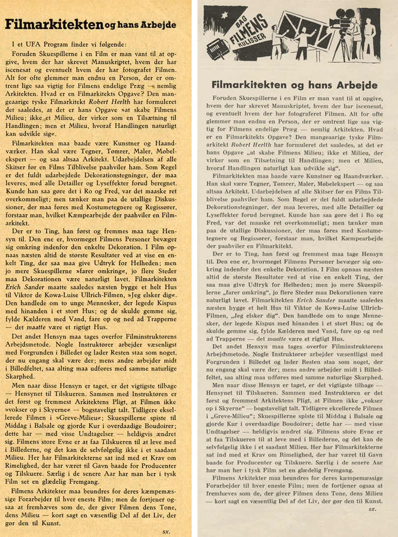 Det samme gælder øjensynlig ikke helt en anden filmskribent, som senere melder sig under modstandsgruppen BOPA’s faner og efter krigen bidrager jævnligt til Kosmorama, nemlig Erik S. Saxtorph. I slutningen af august 1940 skriver han en jobansøgning til von Hake på Ufa (Sørensen 2014: 156). Saxtorph vil skrive artikler til FILMs tyske modstykke, bladet Film-Kurier. Om han faktisk gjorde det er usikkert, for Film-Kurier publicerede ikke alle artikler med signatur. Til gengæld er det overvejende sandsynligt, at Saxtorph skrev til Ufa-Programmet. Med den allerede beskrevne relancering af Programmet i august måned introduceres en fast klumme under titlen ’Bag Filmens Kulisser’. Og her er tale om et alment filmhistorisk oplysende element, der fortynder det ellers tydeligt tysk-propagandistiske indhold i Programmet. Den første klumme af slagsen bærer overskriften ”Filmarkitekten og hans Arbejde” og handler om arbejdet med at skabe film-sets, eksemplificeret med tyske film og ”Filmarkitekter” (Ufa-Programmet 1. årg., nr. 1, s. 2). Den samme artikel løftes fuldstændig uændret over i FILM (1940, nr. 41, s. 17) og udgør det første, men bestemt ikke det sidste, eksempel på, at Ufa-stof vandrer uredigeret fra Programmet ind i FILMs spalter.