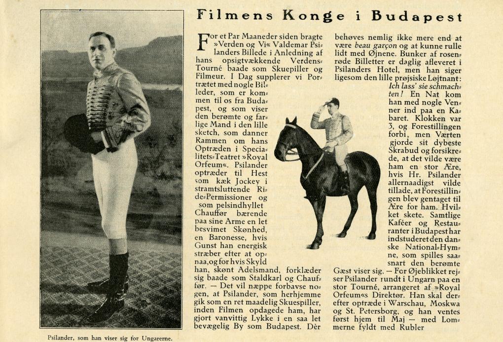 Psilanders storhed, både i Danmark og internationalt, bliver dog først rigtigt slået fast, da han i februar 1914 bliver hyret af en ungarsk varietédirektør til at optræde live i Royal Orfeum i Budapest. Showet bliver en blanding af film og sceneoptræden og får titlen Grev Dahlborgs Hemmelighed. Psilander har på Nordisk Film i Valby selv financieret filmoptagelserne (322 meter), som indleder forestillingen, hvorefter han kommer sprængende ind på scenen til hest, og handlingen fortsætter live. Den danske presse svælger i begivenheden, ikke mindst den tårnhøje gage, og refererer fra ungarske aviser om de nærmest tumultagtige scener, der udspiller sig i forbindelse med Psilanders tilstedeværelse. Man får indtryk af, at hele Budapest har stået på gloende pæle for den danske stjerne.