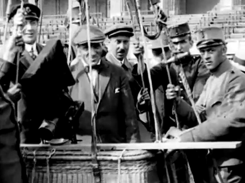 Ballongondolen er klar til opstigning fra Stockholm Stadionmed filmfotografen ombord. Et kamera følger luftballonen…