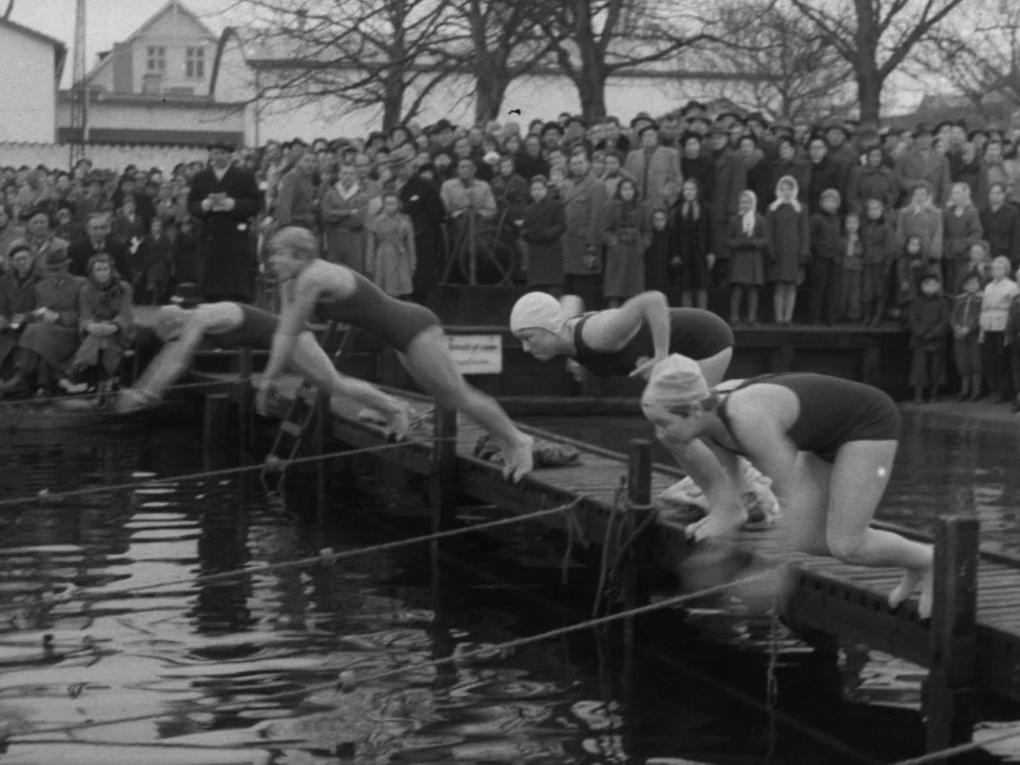 Nytårssvømning og muntert underholdningsindslag i Hellerup Havn i 1952, overværet af 5000 tilskuere.
