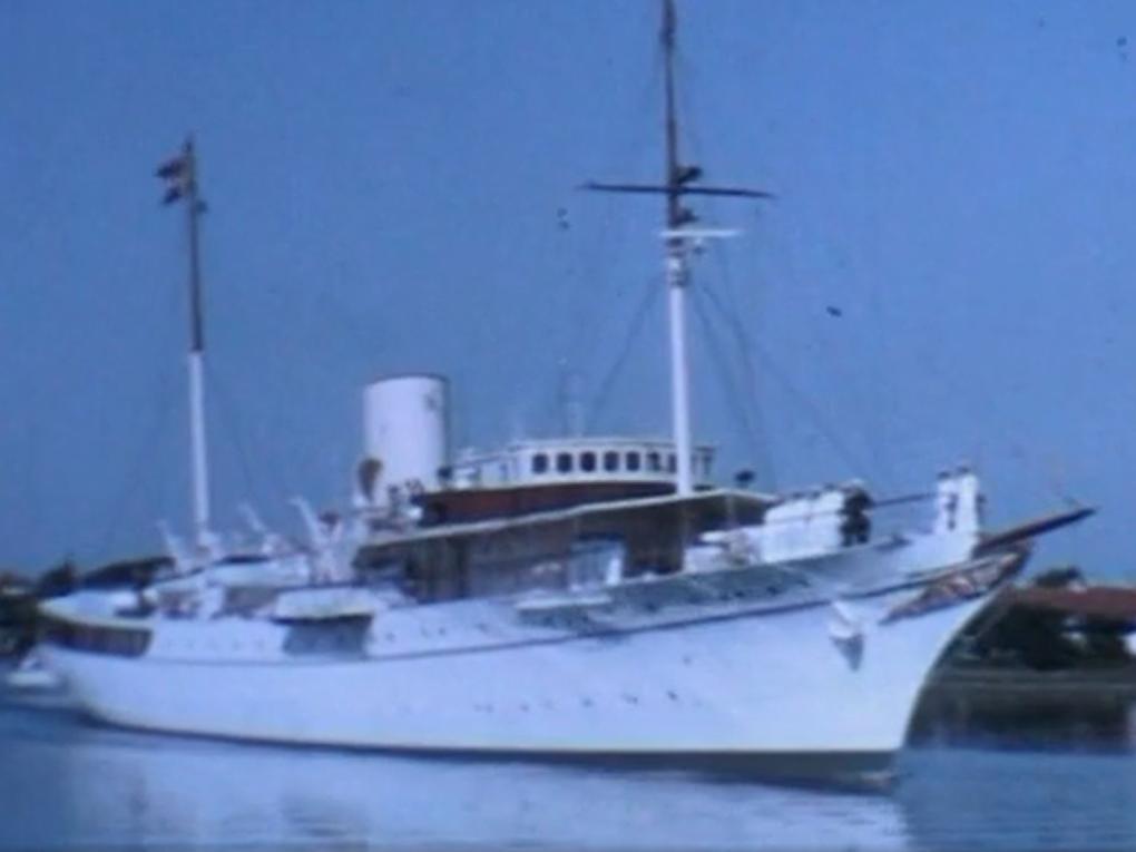 Kong Frederik IX med familie om bord, ankommer til Nakskov. Optagelserne er filmet ombord på skibet M/S 'Dannebrog',…
