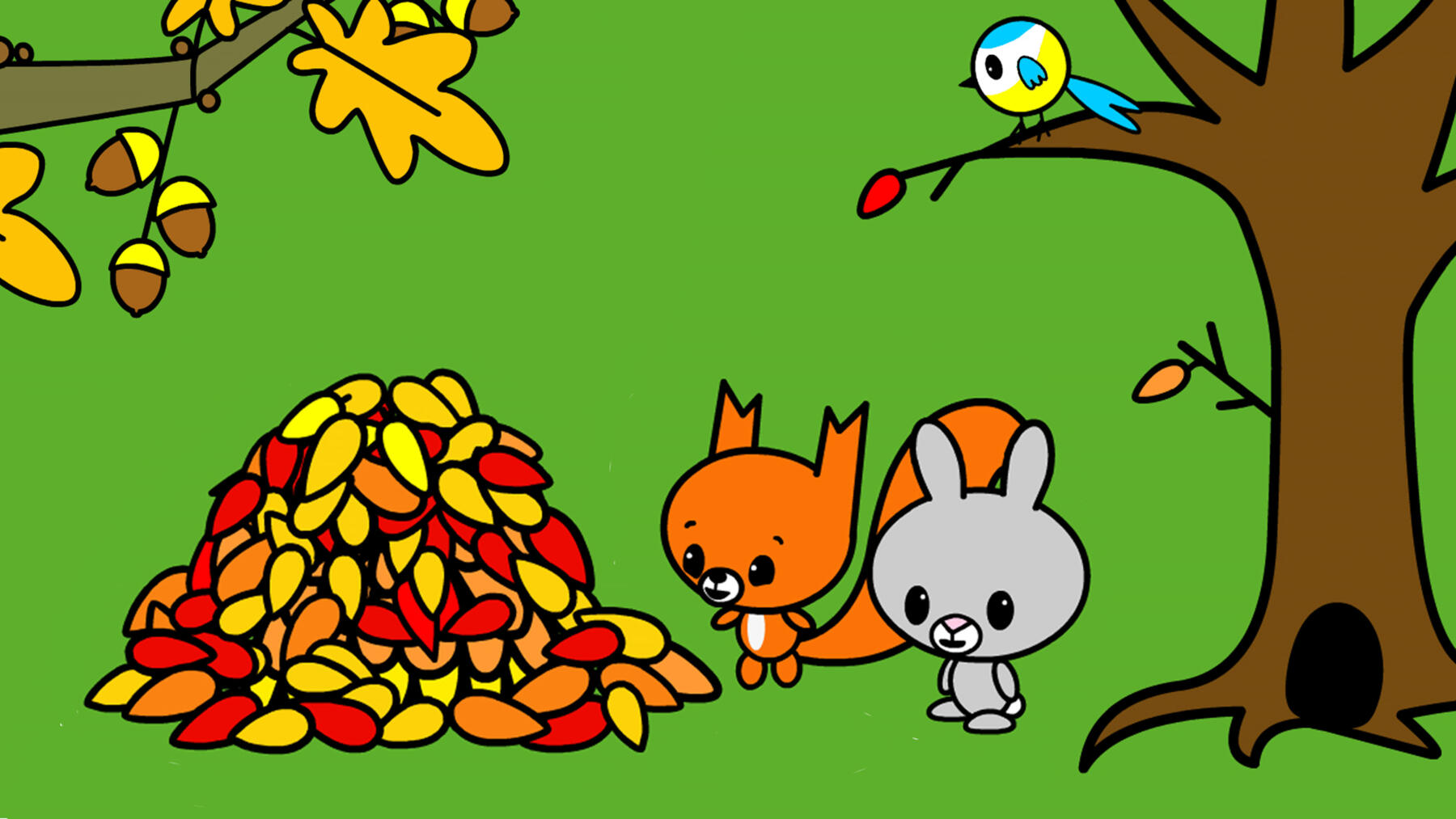 Det er blevet efterår, og Kanin bruger tiden på at samle bunker af alle de blade, der falder af træet. Det er svært at samle bunker, når det hele tiden blæser. Egern kommer forbi, og foreslår, at de hopper i bunkerne, som Kanin lige har lavet. Det er sjovt at lege i bladene! Men da Egern og Kanin vil give bladene tilbage til træet, vil træet ikke tage imod dem.