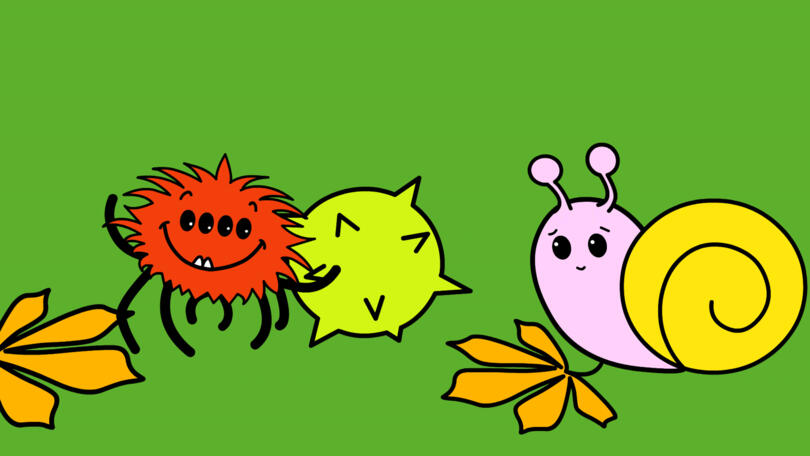 Snegl og Edderkop går tur, da en kastanje lander lige foran dem. Den har pigge, og de synes begge, at den ligner Pindsvin, som også ser sådan ud, når den bliver bange og ruller sig sammen. Egern forklarer dem, at kastanjer vokser på træer og altså ikke er det samme som pindsvin.