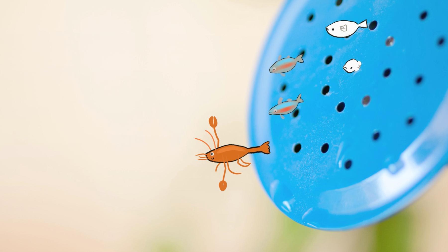 En dreng fortæller om sine dyr: han har en krebs og forskellige fisk. Krebsen prøver hver dag at klatre ud af akvariet.