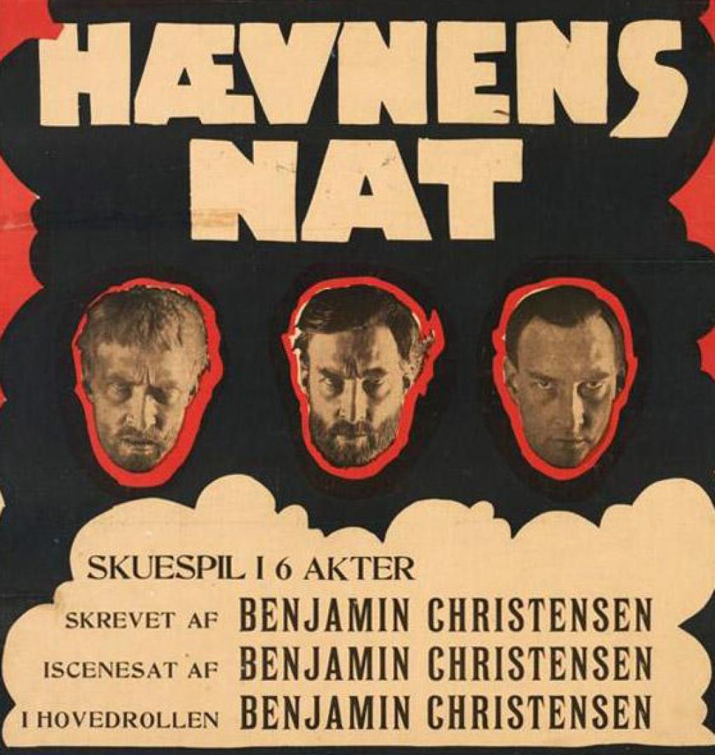 In the first of these examples, we are invited into Valdemar Psilander’s study to see the actor reading for his part of the preacher John Redmond, who duly comes into view in a double exposure – we are taken right inside the head of the greatest star of the time. In the next example, we meet the German author and pacifist Bertha von Suttner. She too is placed in what is supposedly a study, fiddling with some letters and notes. The scene is followed by a clip of the film’s female protagonist and its other stars in more or less theatrical poses. In the intro to Benjamin Christensen’s Blind Justice, we see Christensen with actress Karen Sandberg, the former using a pointer to show her around a model of the main location appearing in the film, Dr West’s house. Entirely in keeping with the rest of the promotional materials supporting the film, Christensen is paraded as the great creator behind the film – quite unsurprisingly, given that self-promotion on a scale veering towards the shameless was one of his signature traits. The poster for the movie is a case in point, serving up three versions of his face: as leading actor, comprising young and old versions of the character, and as the brilliant director behind this international masterpiece. See the poster for Blind Justice ('Hævnens Nat'):