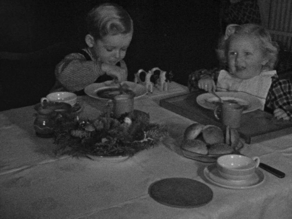 Private optagelser af en familie i Asaa. Familien fejrer jul. En lille pige får en dukkeseng. Tre børn leger i sneen…