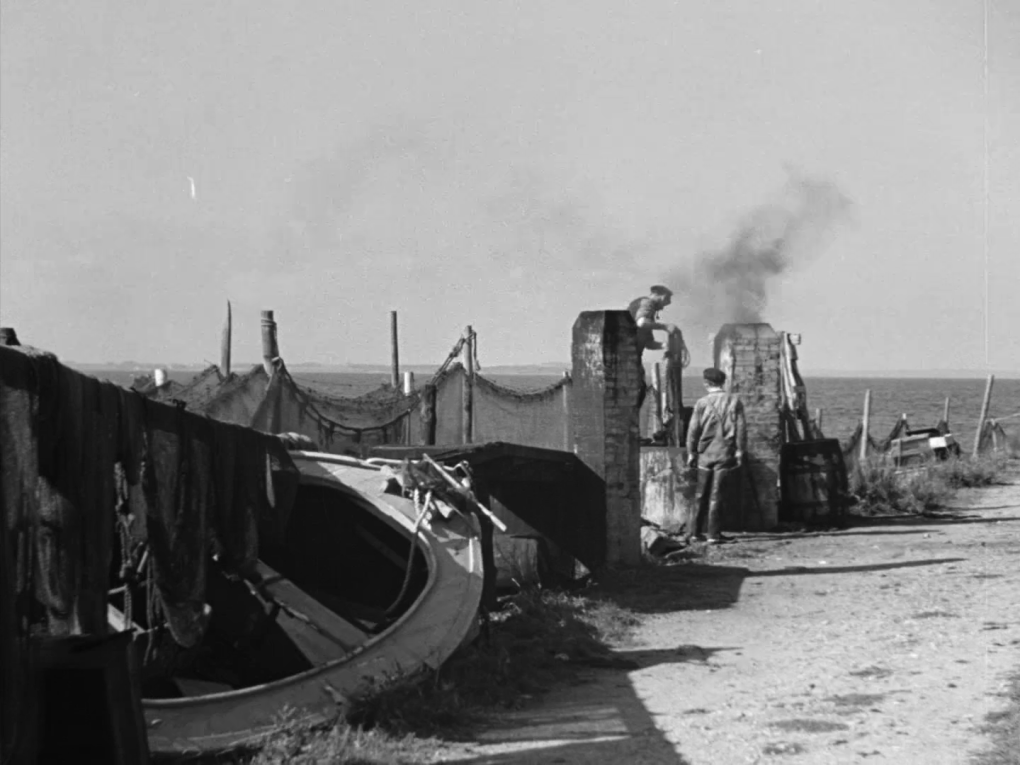 Fiskere barker tovværk og garn i fiskerlejet Ejby Bro (også kaldet Ejby Havn) ved mundingen af Bramsnæs Vig i…