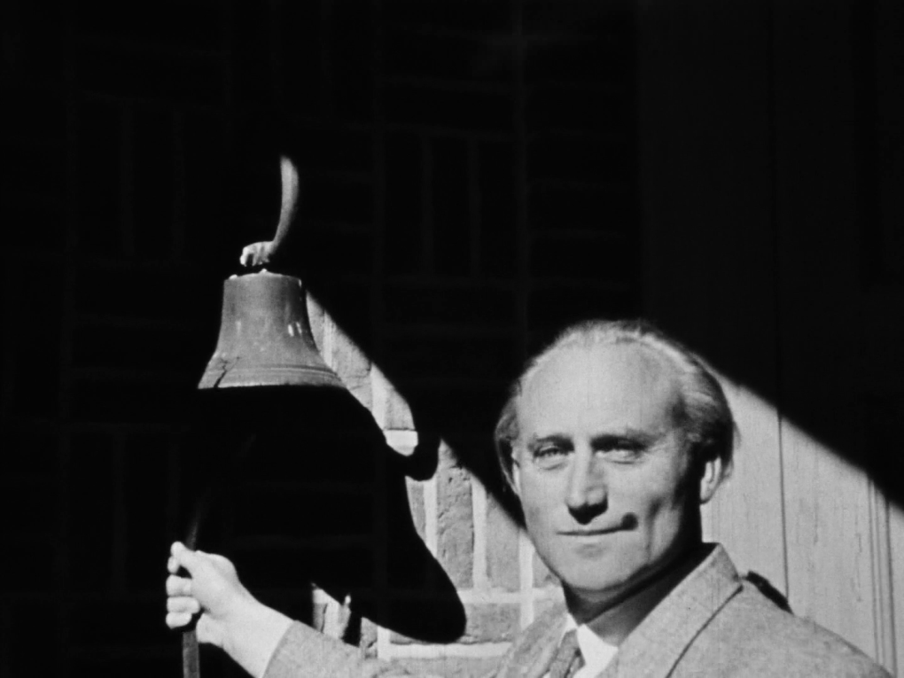 Skoleinspektør Mathisen ringer ud til frikvarter på Dronninglund Kommuneskole i 1949.