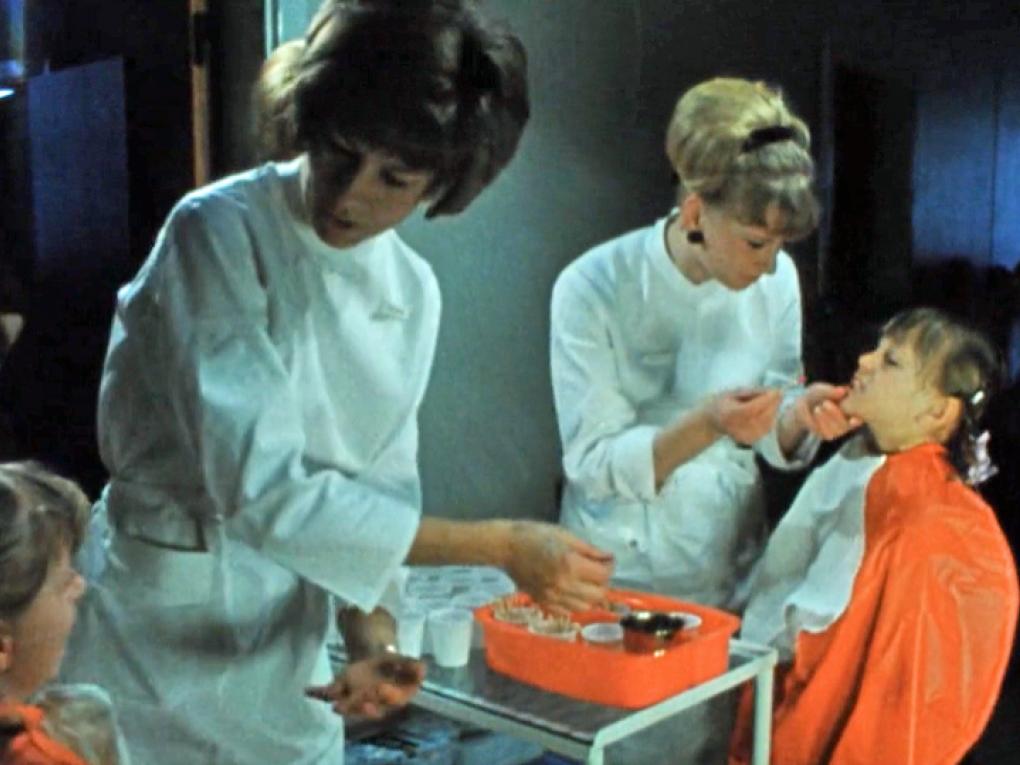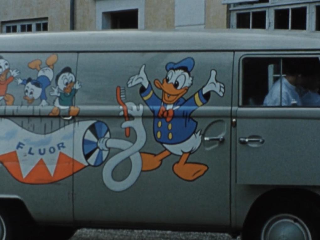 På en skole i Frederikssund kommer en udrykningsvogn med "tandfrøkener" og lærer børnene at børste tænder.