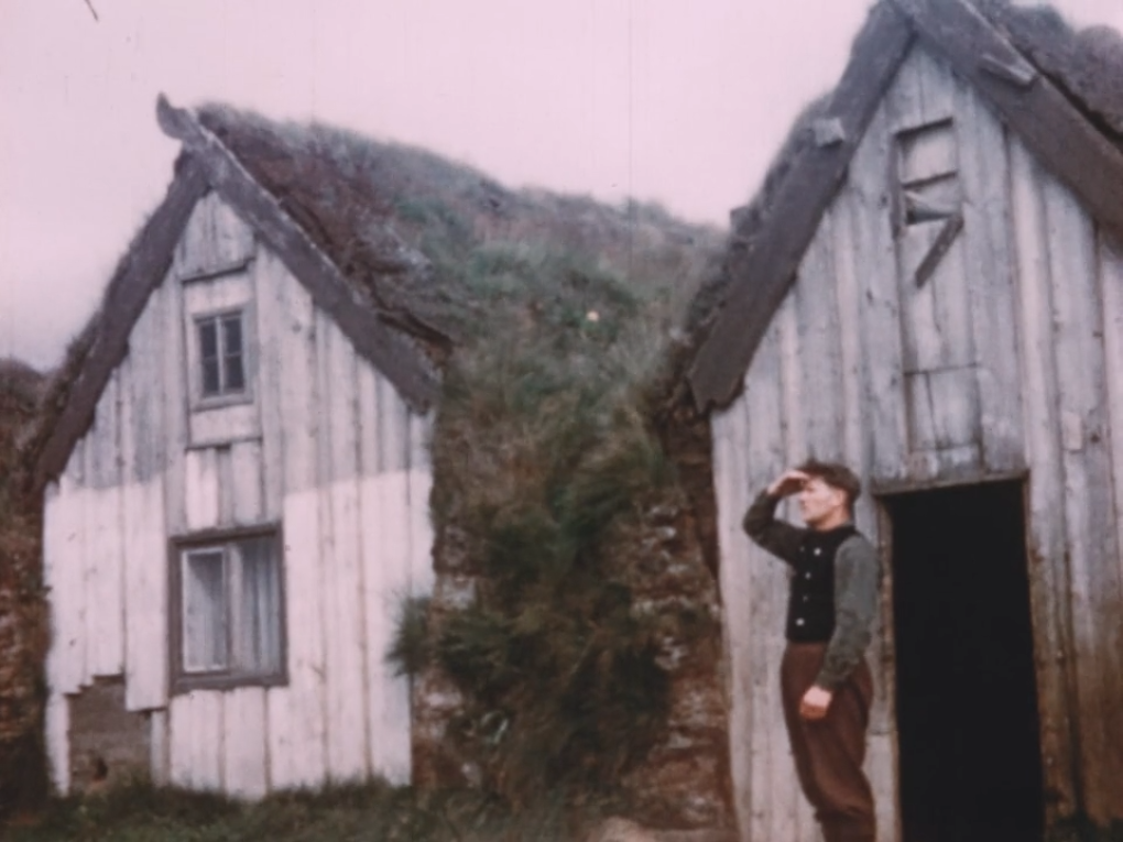 Sviðsett atriði þar sem fjölskylda sést flytja úr Skagafirði vestur um haf á 19. öld. Torfbær í Skagafjörður, kýr…